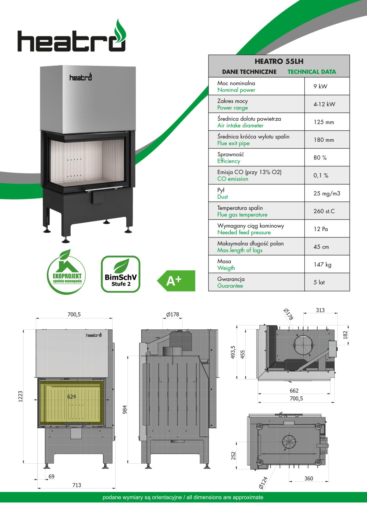 Cu o clasificare A+ in eficienta energetica, acest focar pe lemne ofera performante optime cu consum redus. Puterea nominala de 9 kW si gama variabila de 4-12 kW asigura caldura consistenta si economica in orice moment. Reglarea precisa a temperaturii devine o realitate cu Focar Heatro 55Lh Negru. Ajusteaza caldura in functie de preferintele dvs., oferind o experienta personalizata de incalzire in fiecare moment.